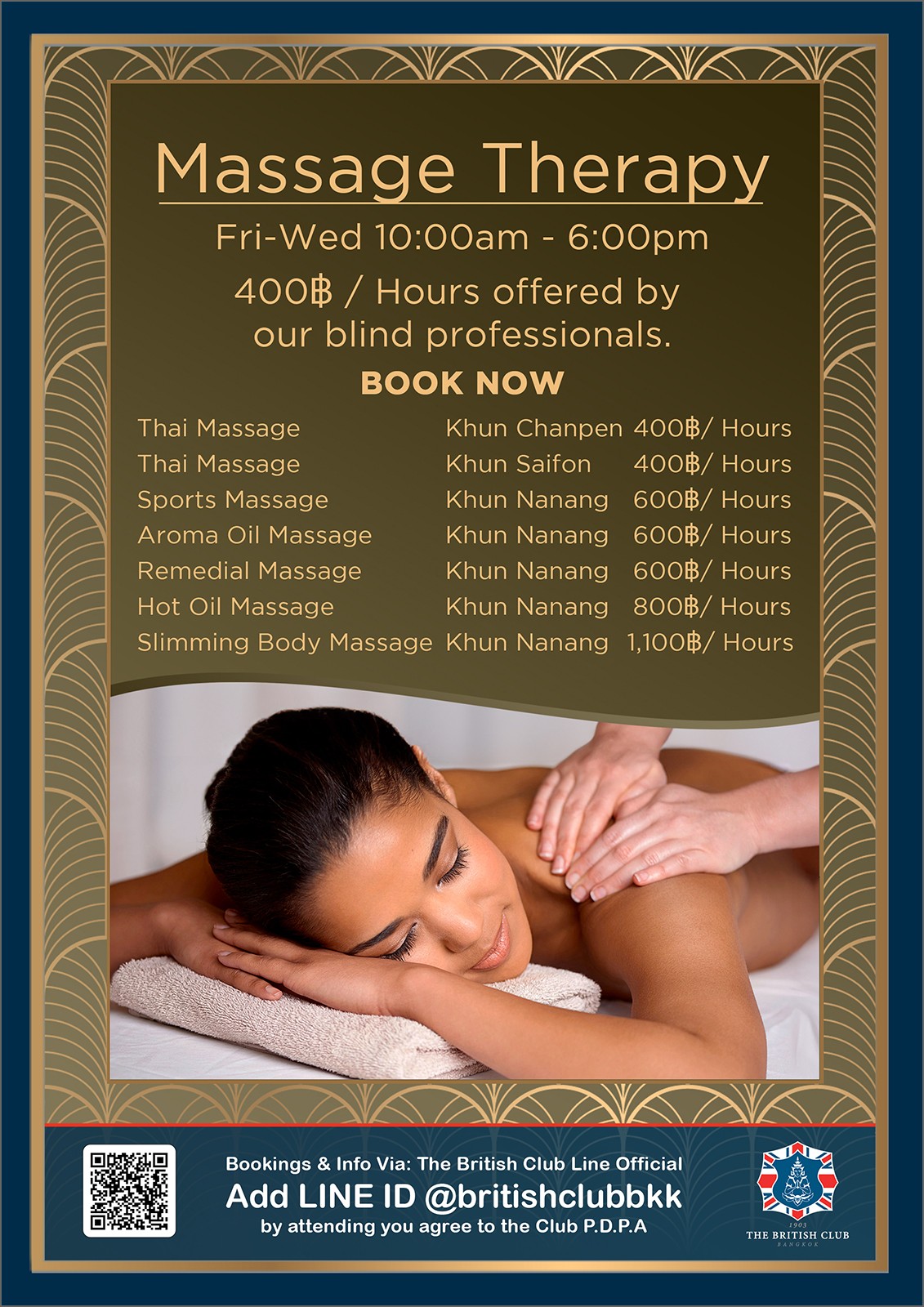 Traditional Thai Massage: Khun Champhen and Khun Saiphon: Thai: Thai massage helps busy people relax, relieves muscle and joint pain, and can also boost a person’s mood. Khun Champen is totally blind and Khun Saiphon is partially blind and both have worked at the British Club for over 30 years. People without the sense of sight have heightened perception in their other senses and they are both true experts in their craft. Over the years they have helped British Club Members with every sports injury imaginable including elbows, knees, shoulders, backs, the lot. Even if there are no physical problems, (yet) the benefits of Thai massage are many and a regular weekly massage is a wonderful way to avoid future injuries! Khun Champhen and Khun Saiphon are both also actively involved with the Blind Massage School in Bangkok and contribute to regular seminars for continued professional development.